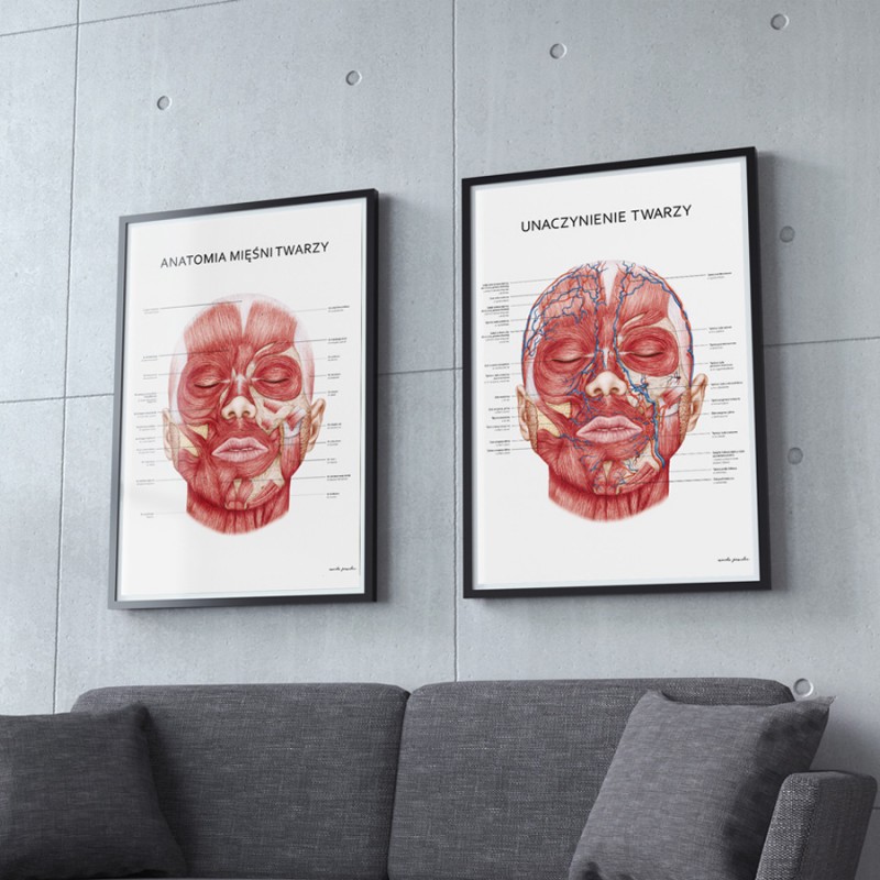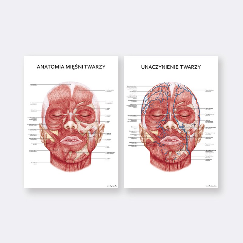 – Komplet 2 plakatów przedstawiających anatomię twarzy: mięśnie mimiczne oraz unaczynienie twarzy
